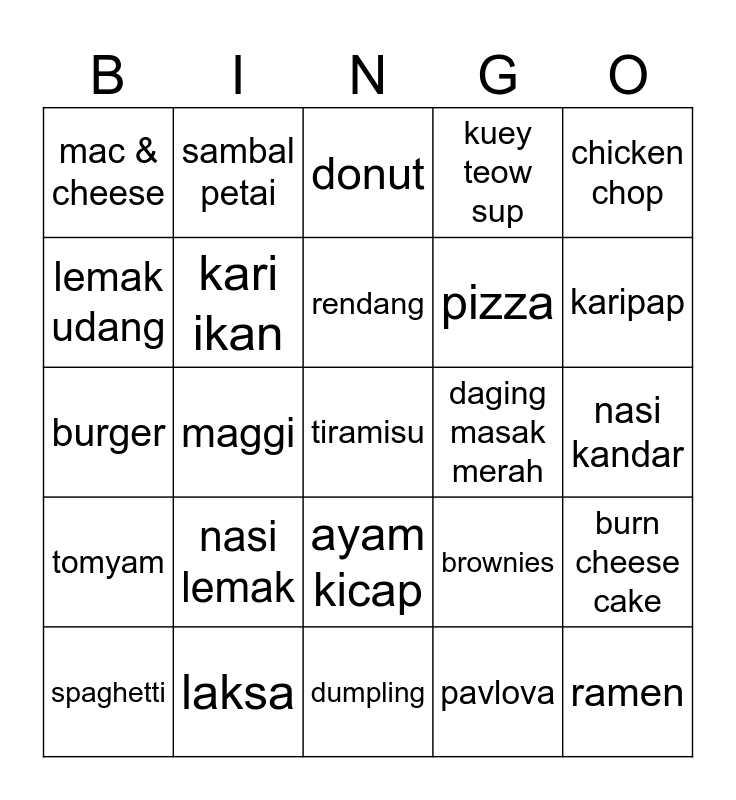 This bingo card has a free space and 24 words: nasi lemak, laksa, rendang, spaghetti, chicken chop, mac & cheese, lemak udang, sambal petai, daging masak merah, ayam kicap, pizza, burger, brownies, burn cheese cake, kari ikan, pavlova, nasi kandar, donut, karipap, maggi, ramen, tomyam, kuey teow sup and dumpling.