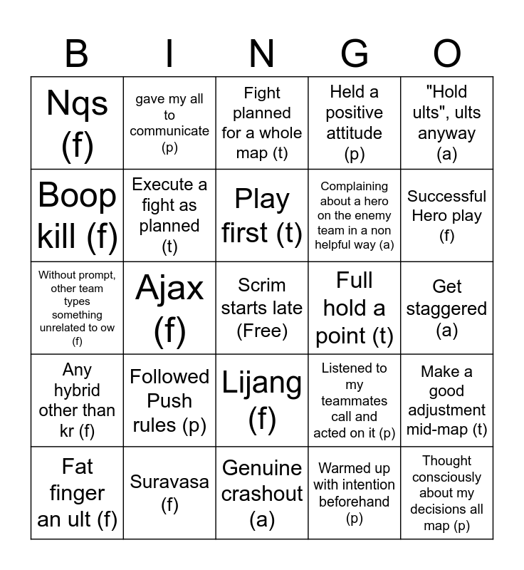 This bingo card has a free space and 24 words: Followed Push rules (p), Suravasa (f), Play first (t), Fat finger an ult (f), "Hold ults", ults anyway (a), Nqs (f), Boop kill (f), gave my all to communicate (p), Full hold a point (t), Lijang (f), Complaining about a hero on the enemy team in a non helpful way (a), Without prompt, other team types something unrelated to ow (f), Listened to my teammates call and acted on it (p), Make a good adjustment mid-map (t), Execute a fight as planned (t), Warmed up with intention beforehand (p), Get staggered (a), Fight planned for a whole map (t), Successful Hero play (f), Ajax (f), Thought consciously about my decisions all map (p), Any hybrid other than kr (f), Held a positive attitude (p) and Genuine crashout (a).