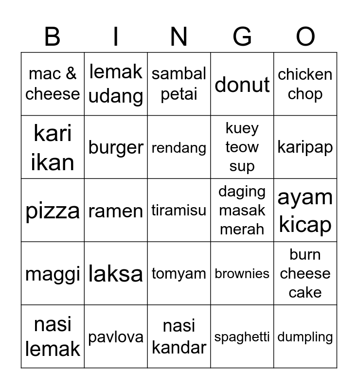 This bingo card has a free space and 24 words: nasi lemak, laksa, rendang, spaghetti, chicken chop, mac & cheese, lemak udang, sambal petai, daging masak merah, ayam kicap, pizza, burger, brownies, burn cheese cake, kari ikan, pavlova, nasi kandar, donut, karipap, maggi, ramen, tomyam, kuey teow sup and dumpling.