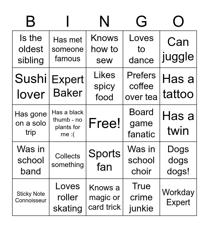 This bingo card has a free space and 43 words: Chief Emoji Officer, Workday Expert, Spreadsheet Wizard, Sticky Note Connoisseur, Watches reality TV, True crime junkie, Knows how to sew, Can play an instrument, Can juggle, Loves roller skating, Loves to dance, Board game fanatic, Sports fan, Collects something, DIY extraordinaire, Knows a magic or card trick, Has a side hustle, Has gone on a solo trip, Has been on TV, Has a tattoo, Has met someone famous, Speaks more than one language, Afraid of heights, Is the oldest sibling, Is the youngest sibling, Has a twin, Went to summer camp, Played sports as a kid, Was in school choir, Was in school band, Cats cats cats!, Dogs dogs dogs!, Has a green thumb - plants plants plants!, Has a black thumb - no plants for me :(, Early bird, Night owl, Wears glasses/contacts, Likes spicy food, Sushi lover, Prefers coffee over tea, Prefers tea over coffee, Expert Baker and Amateur Chef.