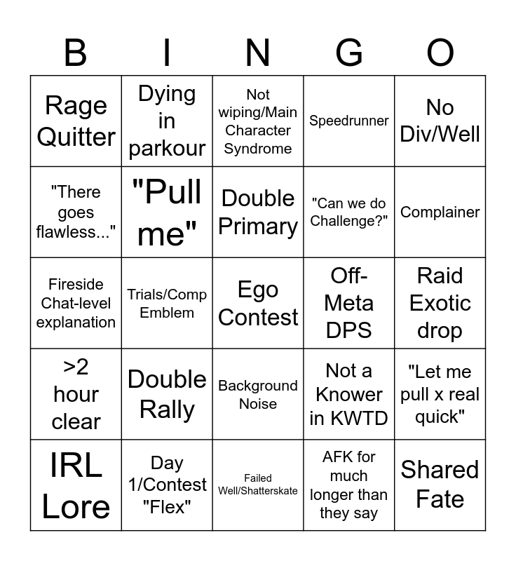 This bingo card has a free space and 24 words: Double Rally, Day 1/Contest "Flex", Double Primary, IRL Lore, No Div/Well, Rage Quitter, "There goes flawless...", Dying in parkour, Off-Meta DPS, Background Noise, "Can we do Challenge?", Fireside Chat-level explanation, Not a Knower in KWTD, "Let me pull x real quick", "Pull me", AFK for much longer than they say, Raid Exotic drop, Not wiping/Main Character Syndrome, Complainer, Trials/Comp Emblem, Shared Fate, >2 hour clear, Speedrunner and Failed Well/Shatterskate.