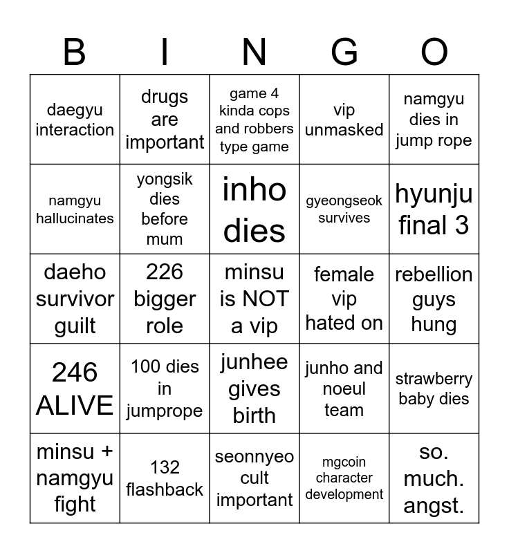 This bingo card has a free space and 26 words: junhee gives birth, mgcoin character development, inho dies, 132 flashback, namgyu dies in jump rope, daegyu interaction, namgyu hallucinates, drugs are important, rebellion guys hung, junho and noeul team, gyeongseok survives, daeho survivor guilt, strawberry baby dies, minsu + namgyu fight, 226 bigger role, daeho dies, vip unmasked, 246 ALIVE, game 4 kinda cops and robbers type game, so. much. angst., hyunju final 3, seonnyeo cult important, female vip hated on, 100 dies in jumprope, yongsik dies before mum and namgyu psycho arc.