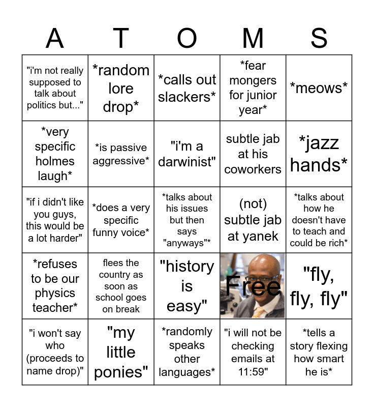 This bingo card has 1 images and 25 words: flees the country as soon as school goes on break, *randomly speaks other languages*, "i'm a darwinist", "i won't say who (proceeds to name drop)", *meows*, "i'm not really supposed to talk about politics but...", *very specific holmes laugh*, *random lore drop*, (not) subtle jab at yanek, "history is easy", subtle jab at his coworkers, "if i didn't like you guys, this would be a lot harder", Free, "fly, fly, fly", *is passive aggressive*, *tells a story flexing how smart he is*, *talks about how he doesn't have to teach and could be rich*, *calls out slackers*, *jazz hands*, *does a very specific funny voice*, *talks about his issues but then says "anyways"*, "my little ponies", *refuses to be our physics teacher*, *fear mongers for junior year* and "i will not be checking emails at 11:59".