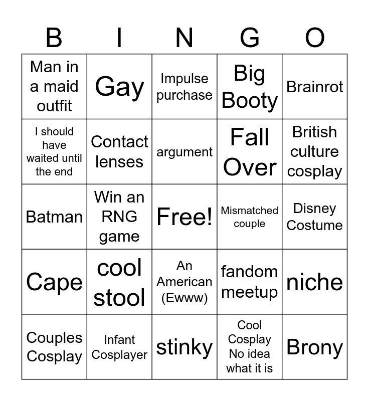 This bingo card has a free space and 24 words: cool stool, Infant Cosplayer, argument, Couples Cosplay, Brainrot, Man in a maid outfit, I should have waited until the end, Gay, Mismatched couple, An American (Ewww), Fall Over, Batman, fandom meetup, niche, Contact lenses, Cool Cosplay No idea what it is, Disney Costume, Impulse purchase, British culture cosplay, Win an RNG game, Brony, Cape, Big Booty and stinky.