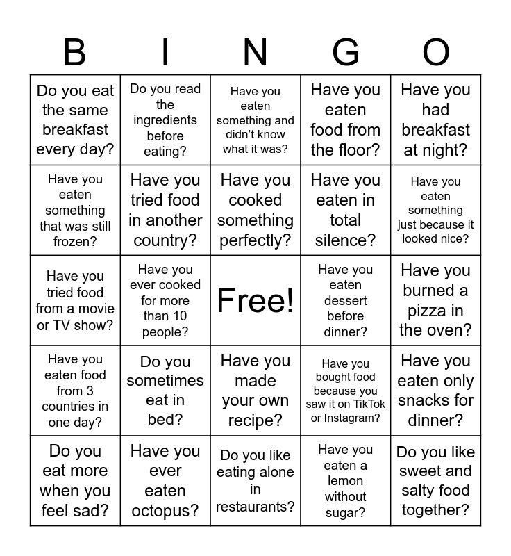 This bingo card has a free space and 30 words: Have you ever eaten octopus?, Do you hate chocolate?, Have you ever cooked for more than 10 people?, Have you cried because food was too spicy?, Do you eat the same breakfast every day?, Have you eaten something and didn’t know what it was?, Have you tried food in another country?, Have you made your own recipe?, Have you eaten dessert before dinner?, Do you like eating alone in restaurants?, Have you burned a pizza in the oven?, Do you like sweet and salty food together?, Have you eaten a lemon without sugar?, Have you spent a whole day without eating?, Have you eaten something just because it looked nice?, Do you eat the pizza crust or leave it?, Have you bought food because you saw it on TikTok or Instagram?, Have you eaten food from 3 countries in one day?, Do you sometimes eat in bed?, Have you had breakfast at night?, Have you tried food from a movie or TV show?, Have you eaten something just to be polite?, Do you read the ingredients before eating?, Have you eaten in total silence?, Have you eaten something that was still frozen?, Have you eaten food from the floor?, Have you eaten only snacks for dinner?, Do you eat more when you feel sad?, Have you cooked something perfectly? and Have you dreamed about food?.
