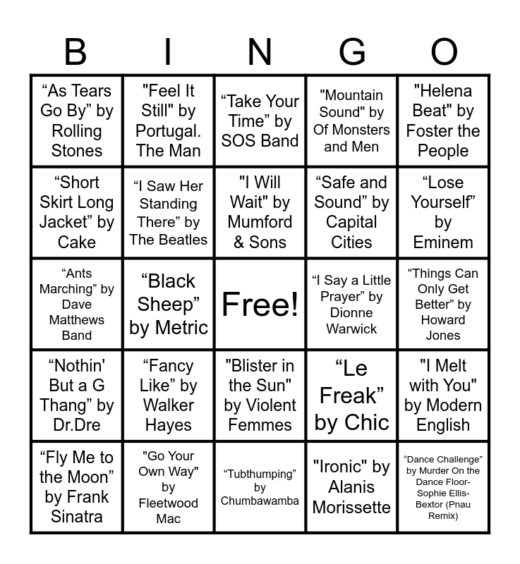 This bingo card has a free space and 85 words: “Let's Dance” by David Bowie, “Push It” by Salt and Peppuh, “Take Your Time” by SOS Band, “Beat It” by Michael Jackson, “Wild Thang” by Tone-Loc, “Celebration” by Kool and the Gang, “Sweet Dreams” by Eurythmics/Annie Lennox, “Super Freak” by Rick James, “Pump up the Jam” by Technotronics, “Drops of Jupiter” by Train, “American Pie” by Don McLean, “We built this city” by Starship, “I Saw Her Standing There” by The Beatles, “I Say a Little Prayer” by Dionne Warwick, “Red Solo Cup” by Toby Keith, “As Tears Go By” by Rolling Stones, “Fly Me to the Moon” by Frank Sinatra, “Short Skirt Long Jacket” by Cake, “Your Love” by The Outfield, “Get Lucky” by Daft Punk, “Sunroof” by Nicky Youre, dazy, “Safe and Sound” by Capital Cities, “Dance Challenge” by Murder On the Dance Floor-Sophie Ellis-Bextor (Pnau Remix), “Feel Good Inc” by Gorillaz, “Black Sheep” by Metric, “Black Betty” by Caravan Palace, “Lil Boo Thang” by Paul Russell, “Walk this way” by Run DMC & Aerosmith, “A Bar Song (Tipsy)” by Shaboozey, “Good to Be Alive” by Andy Grammer, “Fancy Like” by Walker Hayes, “Mr. Jones” by Counting Crows, “When I've Been Drinking” by Jon Pardi, “Ants Marching” by Dave Matthews Band, “Run-Around” by Blues Traveler, “Shoop” by Salt-N-Peppa, “Tubthumping” by Chumbawamba, “California Love” by Tupac, “Nothin' But a G Thang” by Dr.Dre, “Lose Yourself” by Eminem, “Friends in Low Places” by Garth Brooks, “New to Country” by Bailey Zimmerman, "Some Nights" by fun., "Riptide" by Vance Joy, "It's a Long Way to the Top (If You Wanna Rock ‘N’ Roll" by AC/DC, "Ride" by Twenty One Pilots, "Heathens" by Twenty One Pilots, "Diane Young" by Vampire Weekend, "Chocolate" by The 1975, "1901" by Phoenix, "Feel It Still" by Portugal. The Man, "I Will Wait" by Mumford & Sons, "One Love / People Get Ready" by Bob Marley & The Wailers, "Running Down a Dream" by Tom Petty, "Franklin's Tower" by Grateful Dead, "Cumberland Blues" by Grateful Dead, "Go Your Own Way" by Fleetwood Mac, "Mountain Sound" by Of Monsters and Men, "Been Caught Stealing" by Jane's Addiction, "Walking On A Dream" by Empire of the Sun, "Ramble On" by Led Zeppelin, "Levitating" by Dua Lipa, "Our Lips Are Sealed" by The Go-Go's, "How Soon is Now" by The Smith's, "Hotel California" by The Eagles, "Helena Beat" by Foster the People, "Train in Vain" by The Clash, "I Melt with You" by Modern English, "Beautiful Day" by U2, "Team" by Lorde, "Pretty in Pink" by The Psychedelic Furs, "What I Like About You" by The Romantics, "On the Outside" by Oingo Boingo, "Hungry Like the Wolf" by Duran Duran, "Blue Monday" by New Order, "Blister in the Sun" by Violent Femmes, "Ironic" by Alanis Morissette, "Return of the Mack" by Mark Morrison, "Yeah!" by Usher, “Free Fallin'” by Tom Petty., “Things Can Only Get Better” by Howard Jones, “Pink Pony Club” by Chappell Roan, “Shake It Off” by Taylor Swift, “Le Freak” by Chic and “Brick House” by Commodores.