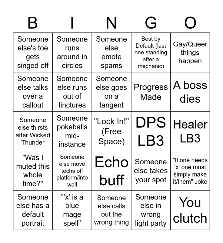This bingo card has a free space and 39 words: We start on time, Someone else's gear breaks, Someone else forgets food buff for a pull, Someone else runs out of tinctures, Someone else has a default portrait, Echo buff, Someone else goes on a tangent, Degeneracy Happens, Gay/Queer things happen, "Was I muted this whole time?", Someone pokeballs mid-instance, Best by Default (last one standing after a mechanic), You clutch, Healer LB3, DPS LB3, Someone else move techs off platform/into wall, Someone else kills you, Someone else's toe gets singed off, Someone else accidentally or early pulls, Someone else takes your spot, Someone else talks over a callout, Someone else calls out the wrong thing, Progress Made, A boss dies, Someone else mentions Majong, Someone else mentions Yakuza, Someone else mentions Sonic (Including music), Someone else mentions furry things, Someone else mentions Deltarune, Someone runs around in circles, Someone else crafts during break, Someone else ability spams (out of combat), Someone else emote spams, "'x' is a blue mage spell", Someone else in wrong light party, Someone else mentions/plays Antimatter Dimensions, "If one needs 'x' one must simply make it/them" Joke, Someone else thirsts after Wicked Thunder and Someone else makes a horsecock joke.