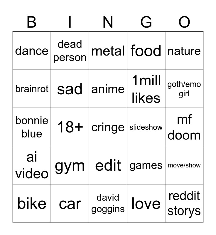 This bingo card has a free space and 24 words: gym, car, anime, bike, nature, dance, brainrot, dead person, slideshow, edit, 1mill likes, bonnie blue, games, move/show, sad, love, mf doom, metal, goth/emo girl, 18+, reddit storys, ai video, food and david goggins.