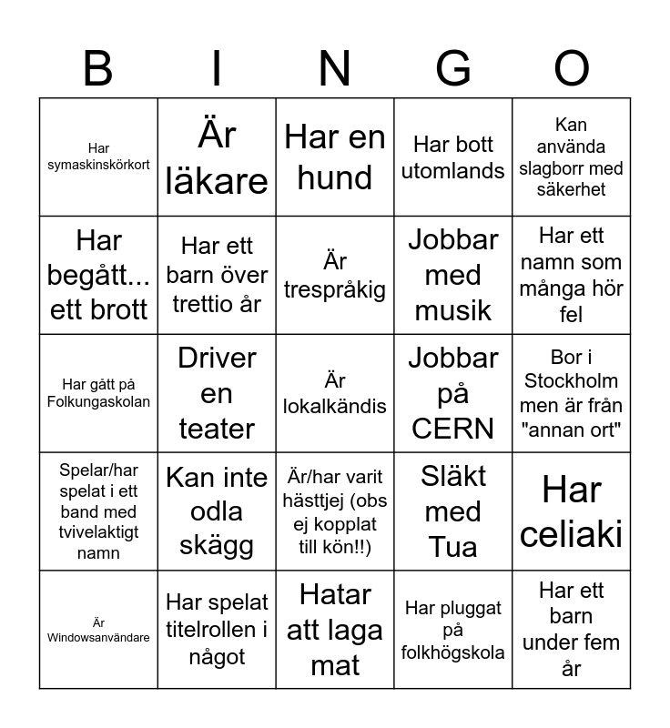 This bingo card has 25 words: Kan inte odla skägg, Hatar att laga mat, Är trespråkig, Är Windowsanvändare, Kan använda slagborr med säkerhet, Har symaskinskörkort, Har begått... ett brott, Är läkare, Jobbar på CERN, Är/har varit hästtjej (obs ej kopplat till kön!!), Jobbar med musik, Har gått på Folkungaskolan, Släkt med Tua, Har celiaki, Har ett barn över trettio år, Har ett barn under fem år, Bor i Stockholm men är från "annan ort", Har en hund, Har ett namn som många hör fel, Driver en teater, Är lokalkändis, Har spelat titelrollen i något, Spelar/har spelat i ett band med tvivelaktigt namn, Har bott utomlands and Har pluggat på folkhögskola.