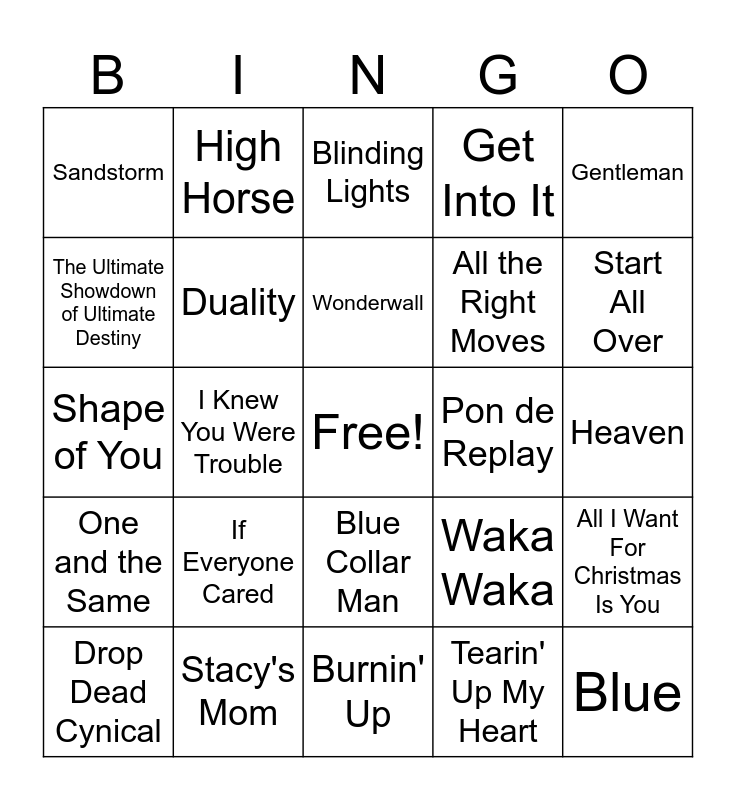 This bingo card has a free space and 24 words: If Everyone Cared, Stacy's Mom, Wonderwall, Drop Dead Cynical, Gentleman, Sandstorm, The Ultimate Showdown of Ultimate Destiny, High Horse, Pon de Replay, Blue Collar Man, All the Right Moves, Shape of You, Waka Waka, All I Want For Christmas Is You, Duality, Tearin' Up My Heart, Heaven, Blinding Lights, Start All Over, I Knew You Were Trouble, Blue, One and the Same, Get Into It and Burnin' Up.