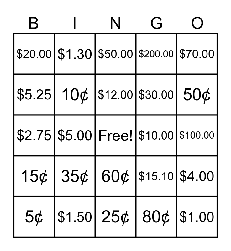 This bingo card has a free space and 29 words: 5¢, $2.00, $5.00, 75¢, $20.00, $50.00, 10¢, 35¢, $10.00, $1.50, $100.00, $1.00, 25¢, 80¢, 50¢, $40.00, 60¢, 15¢, $70.00, $2.75, $15.10, $10.30, $30.00, $5.25, $200.00, $1.30, $4.00, $12.00 and $2.10.