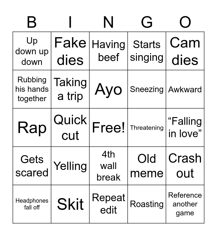 This bingo card has a free space and 24 words: Yelling, Skit, Ayo, Headphones fall off, Cam dies, Up down up down, Rubbing his hands together, Fake dies, Threatening, 4th wall break, Sneezing, Rap, Old meme, Crash out, Taking a trip, Roasting, “Falling in love”, Having beef, Awkward, Quick cut, Reference another game, Gets scared, Starts singing and Repeat edit.