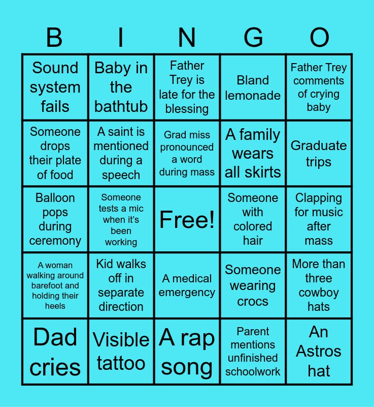 This bingo card has a free space and 24 words: Dad cries, Kid walks off in separate direction, Grad miss pronounced a word during mass, Parent mentions unfinished schoolwork, Father Trey comments of crying baby, Sound system fails, Baby in the bathtub, Father Trey is late for the blessing, Someone with colored hair, Clapping for music after mass, Balloon pops during ceremony, A saint is mentioned during a speech, Someone wearing crocs, More than three cowboy hats, Someone drops their plate of food, Visible tattoo, A rap song, Bland lemonade, Graduate trips, A woman walking around barefoot and holding their heels, Someone tests a mic when it’s been working, A medical emergency, A family wears all skirts and An Astros hat.
