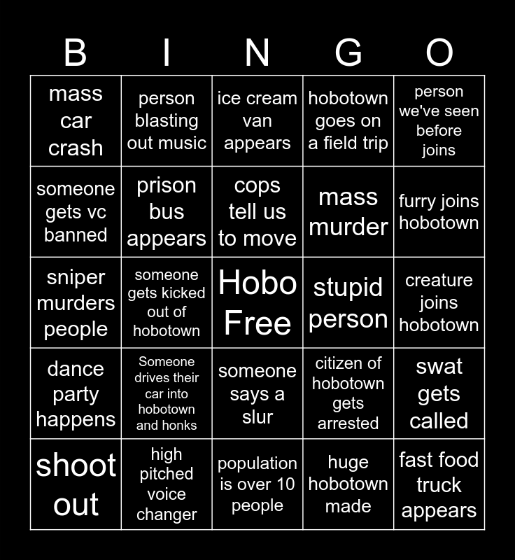 This bingo card has a free space and 24 words: Someone drives their car into hobotown and honks, high pitched voice changer, cops tell us to move, shoot out, person we've seen before joins, mass car crash, someone gets vc banned, person blasting out music, stupid person, someone says a slur, mass murder, sniper murders people, citizen of hobotown gets arrested, swat gets called, prison bus appears, huge hobotown made, creature joins hobotown, ice cream van appears, furry joins hobotown, someone gets kicked out of hobotown, fast food truck appears, dance party happens, hobotown goes on a field trip and population is over 10 people.