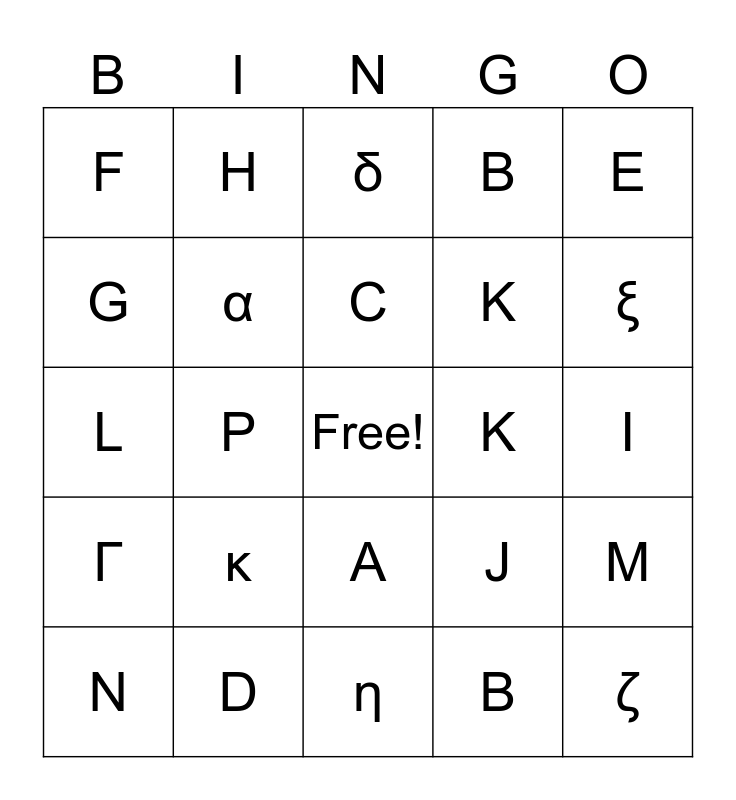 This bingo card has a free space and 26 words: A, B, C, D, E, F, G, H, I, J, K, L, M, N, P, Α, Β, Γ, δ, ζ, ξ, η, Κ, κ, α and ο ς ε τ τ υ θ.