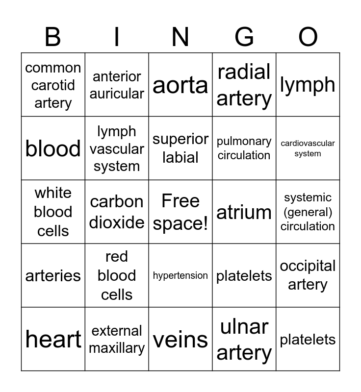 This bingo card has a free space and 29 words: heart, capillaries, carbon dioxide, ventricle, common carotid artery, aorta, lymph vascular system, red blood cells, atrium, external maxillary, systemic (general) circulation, platelets, veins, ulnar artery, cardiovascular system, pericardium, hypertension, arteries, lymph, white blood cells, platelets, plasma, pulmonary circulation, blood, radial artery, anterior auricular, occipital artery, superior labial and popliteal.
