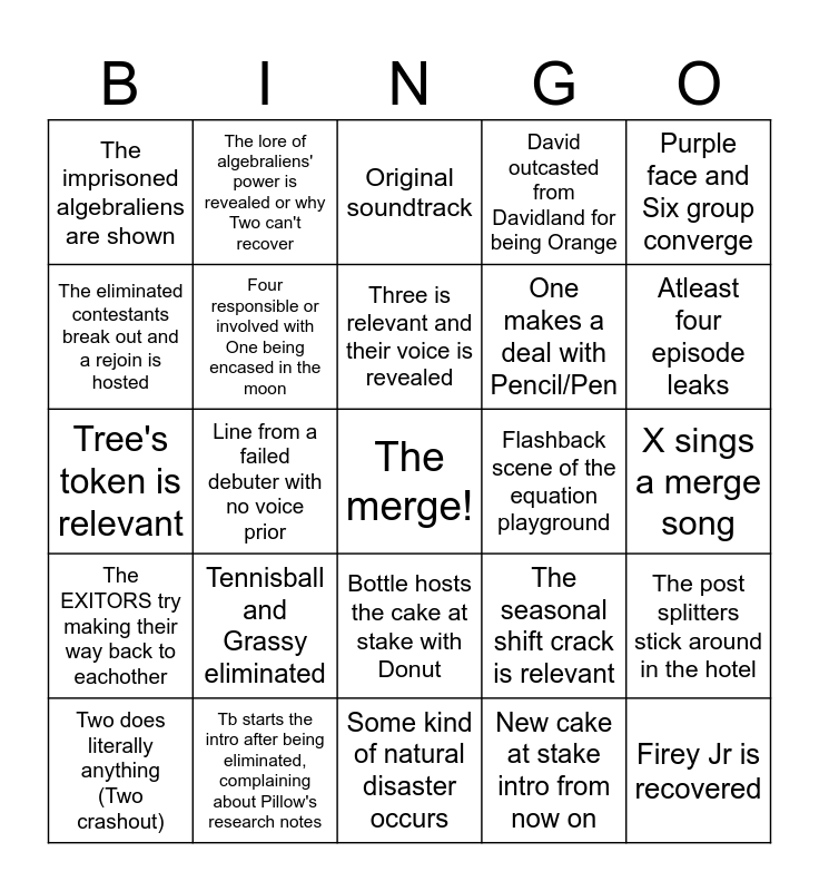 This bingo card has a free space and 24 words: Tennisball and Grassy eliminated, Tb starts the intro after being eliminated, complaining about Pillow's research notes, Three is relevant and their voice is revealed, Two does literally anything (Two crashout), Purple face and Six group converge, The imprisoned algebraliens are shown, The eliminated contestants break out and a rejoin is hosted, The lore of algebraliens' power is revealed or why Two can't recover, Flashback scene of the equation playground, Bottle hosts the cake at stake with Donut, One makes a deal with Pencil/Pen, Tree's token is relevant, The seasonal shift crack is relevant, The post splitters stick around in the hotel, Four responsible or involved with One being encased in the moon, New cake at stake intro from now on, X sings a merge song, Original soundtrack, Atleast four episode leaks, Line from a failed debuter with no voice prior, Firey Jr is recovered, The EXITORS try making their way back to eachother, David outcasted from Davidland for being Orange and Some kind of natural disaster occurs.