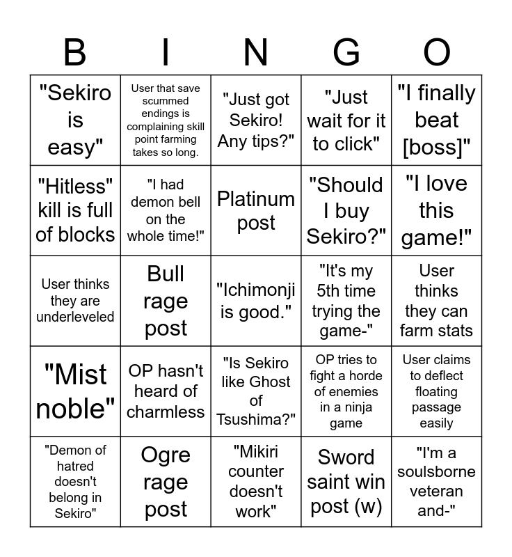 This bingo card has a free space and 24 words: OP hasn't heard of charmless, Ogre rage post, Platinum post, "Demon of hatred doesn't belong in Sekiro", "I finally beat [boss]", "Sekiro is easy", "Hitless" kill is full of blocks, User that save scummed endings is complaining skill point farming takes so long., "It's my 5th time trying the game-", "Is Sekiro like Ghost of Tsushima?", "Should I buy Sekiro?", User thinks they are underleveled, OP tries to fight a horde of enemies in a ninja game, User claims to deflect floating passage easily, "I had demon bell on the whole time!", Sword saint win post (w), User thinks they can farm stats, "Just got Sekiro! Any tips?", "I love this game!", Bull rage post, "I'm a soulsborne veteran and-", "Mist noble", "Just wait for it to click" and "Mikiri counter doesn't work".
