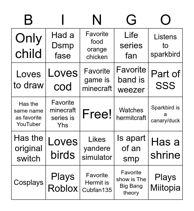 This bingo card has a free space and 24 words: Loves birds, Plays Roblox, Favorite game is minecraft, Cosplays, Listens to sparkbird, Only child, Loves to draw, Had a Dsmp fase, Watches hermitcraft, Likes yandere simulator, Favorite band is weezer, Has the same name as favorite YouTuber, Is apart of an smp, Has a shrine, Loves cod, Favorite show is The Big Bang theory, Sparkbird is a canary/duck, Favorite food orange chicken, Part of SSS, Favorite minecraft series is Yhs, Plays Miitopia, Has the original switch, Life series fan and Favorite Hermit is Cubfan135.