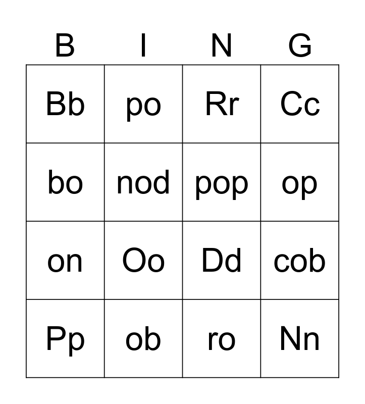 This bingo card has 18 words: Oo, Nn, Rr, Bb, Dd, Cc, Pp, po, op, on, ro, bo, cob, nod, pop, rod, ob and ro.