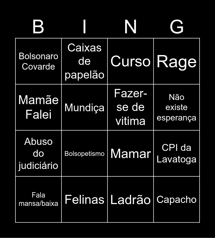 This bingo card has 16 words: Felinas, CPI da Lavatoga, Curso, Bolsonaro Covarde, Abuso do judiciário, Caixas de papelão, Mamar, Ladrão, Mamãe Falei, Mundiça, Fala mansa/baixa, Rage, Bolsopetismo, Não existe esperança, Fazer-se de vitima and Capacho.