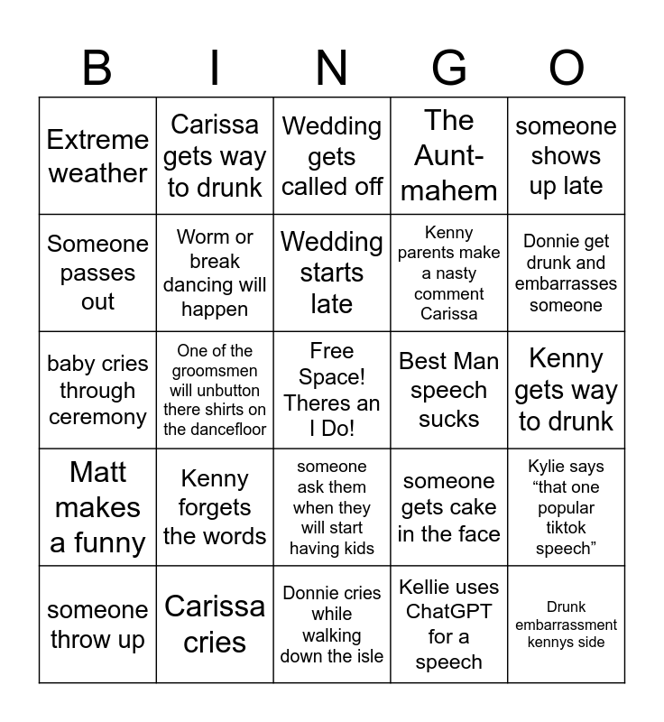 This bingo card has a free space and 24 words: Kenny forgets the words, Carissa cries, Wedding starts late, someone throw up, someone shows up late, Extreme weather, Someone passes out, Carissa gets way to drunk, Best Man speech sucks, someone ask them when they will start having kids, Kenny parents make a nasty comment Carissa, baby cries through ceremony, someone gets cake in the face, Kylie says “that one popular tiktok speech”, Worm or break dancing will happen, Kellie uses ChatGPT for a speech, Kenny gets way to drunk, Wedding gets called off, Donnie get drunk and embarrasses someone, One of the groomsmen will unbutton there shirts on the dancefloor, Drunk embarrassment kennys side, Matt makes a funny, The Aunt-mahem and Donnie cries while walking down the isle.
