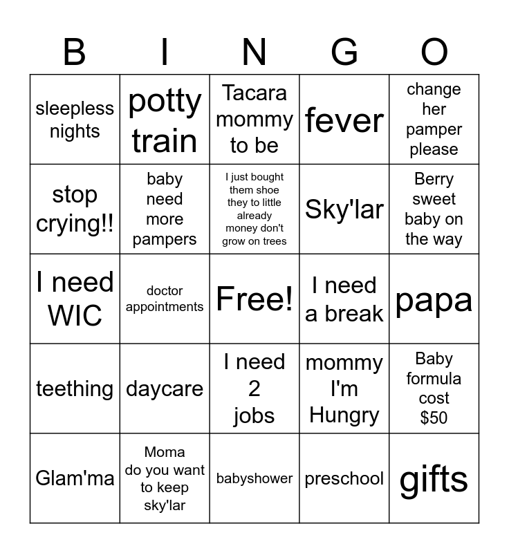 This bingo card has a free space and 24 words: daycare, Moma do you want to keep sky'lar, I just bought them shoe they to little already money don't grow on trees, Glam'ma, change her pamper please, sleepless nights, stop crying!!, potty train, I need a break, I need 2 jobs, Sky'lar, I need WIC, mommy I'm Hungry, Baby formula cost $50, baby need more pampers, preschool, papa, Tacara mommy to be, Berry sweet baby on the way, doctor appointments, gifts, teething, fever and babyshower.