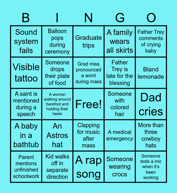 This bingo card has a free space and 24 words: An Astros hat, Kid walks off in separate direction, Grad miss pronounced a word during mass, Parent mentions unfinished schoolwork, Father Trey comments of crying baby, Sound system fails, Visible tattoo, Balloon pops during ceremony, Someone with colored hair, Clapping for music after mass, Father Trey is late for the blessing, A saint is mentioned during a speech, A medical emergency, More than three cowboy hats, Someone drops their plate of food, Someone wearing crocs, Dad cries, Graduate trips, Bland lemonade, A woman walking around barefoot and holding their heels, Someone tests a mic when it’s been working, A baby in a bathtub, A family wears all skirts and A rap song.