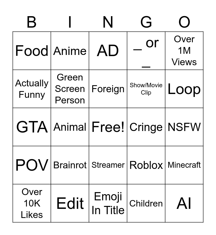 This bingo card has a free space and 24 words: Brainrot, Edit, Foreign, Over 10K Likes, Over 1M Views, Food, Actually Funny, Anime, Cringe, Streamer, Show/Movie Clip, GTA, Roblox, Minecraft, Green Screen Person, Children, NSFW, AD, Loop, Animal, AI, POV, _ or _ and Emoji In Title.