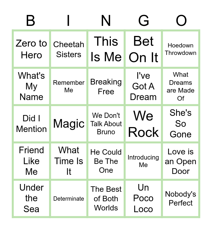 This bingo card has 45 words: You're Welcome, We Don't Talk About Bruno, Let It Go, Under the Sea, I Just Can't Wait to Be King, Un Poco Loco, This Is Me, Cruisin' For A Bruisin', Hoedown Throwdown, Determinate, Bet On It, We Rock, He Could Be The One, What Time Is It, Hasta La Vista, The Best of Both Worlds, I've Got a Dream, Did I Mention, Something About the Sunshine, What Dreams are Made Of, Cheetah Sisters, Hawaiian Roller Coaster Ride, Shiny, Zero to Hero, Into The Unknown, She's So Gone, Push It To The Limit, Can't Stop Singing, Introducing Me, Friend Like Me, Hakuna Matata, Love is an Open Door, Be Our Guest, Gitchee Gitchee Goo, Phineas and Ferb Theme Song, Magic, Do You Want to Build a Snowman?, I Don't Dance, Nobody's Perfect, Breaking Free, What's My Name, I've Got A Dream, Lost in the Woods, Remember Me and Almost There.