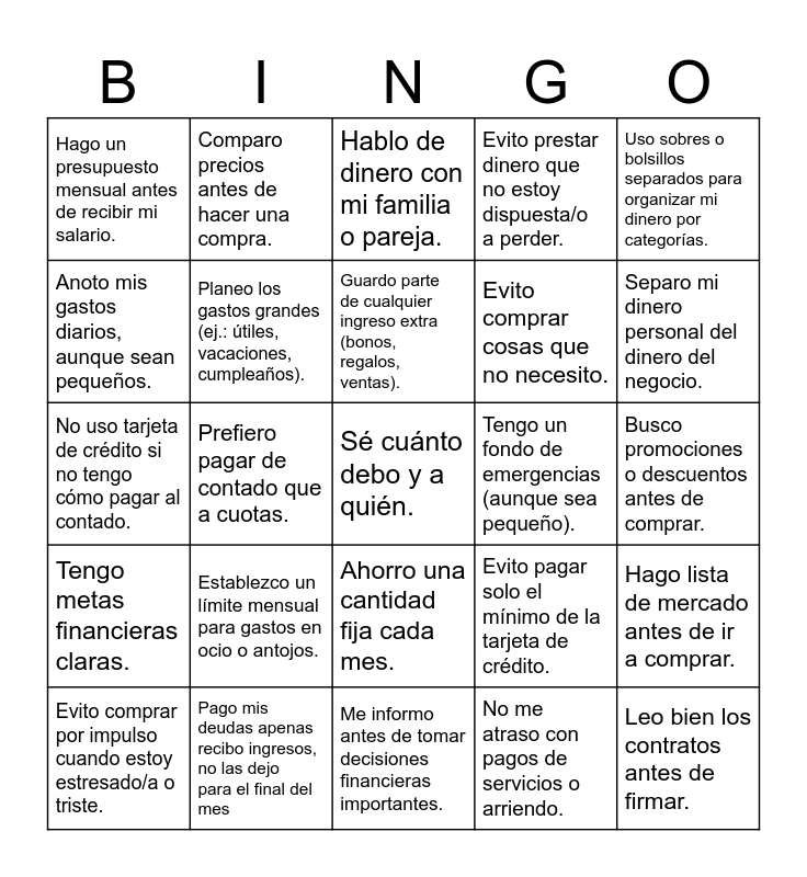 This bingo card has a free space and 24 words: Establezco un límite mensual para gastos en ocio o antojos., Pago mis deudas apenas recibo ingresos, no las dejo para el final del mes, Guardo parte de cualquier ingreso extra (bonos, regalos, ventas)., Evito comprar por impulso cuando estoy estresado/a o triste., Uso sobres o bolsillos separados para organizar mi dinero por categorías., Hago un presupuesto mensual antes de recibir mi salario., Anoto mis gastos diarios, aunque sean pequeños., Comparo precios antes de hacer una compra., Tengo un fondo de emergencias (aunque sea pequeño)., Ahorro una cantidad fija cada mes., Evito comprar cosas que no necesito., No uso tarjeta de crédito si no tengo cómo pagar al contado., Evito pagar solo el mínimo de la tarjeta de crédito., Hago lista de mercado antes de ir a comprar., Planeo los gastos grandes (ej.: útiles, vacaciones, cumpleaños)., No me atraso con pagos de servicios o arriendo., Busco promociones o descuentos antes de comprar., Hablo de dinero con mi familia o pareja., Separo mi dinero personal del dinero del negocio., Prefiero pagar de contado que a cuotas., Leo bien los contratos antes de firmar., Tengo metas financieras claras., Evito prestar dinero que no estoy dispuesta/o a perder. and Me informo antes de tomar decisiones financieras importantes..