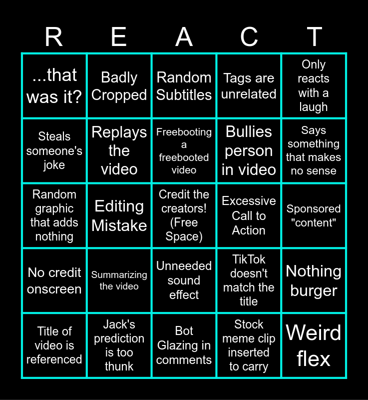 This bingo card has a free space and 42 words: Forgets to React, Freebooting a freebooted video, "This guy" (creator vaguely referenced), Summarizing the video, Stock meme clip inserted to carry, Nothing burger, Weird flex, Talking over the person in the video, Random Subtitles, Unneeded sound effect, Sponsored "content", Says something that makes no sense, Editing Mistake, Only reacts with a laugh, Cringe commentary, TikTok doesn't match the title, Weird inserted biases, Random graphic that adds nothing, Jack predicts what they say/do, Badly Cropped, Steals someone's joke, Over-dramatizing the TikTok, Actual insight, ...that was it?, Random Tangent, Just quotes the OG video, Bullies person in video, Very loud, No links in description, New ReactBot phrase is generated, Editor doing HEAVY lifting, No credit onscreen, Replays the video, Bot Glazing in comments, ReactBot's reaction is better, Title of video is referenced, Jack's prediction is too thunk, Excessive Call to Action, Repeat of a called bingo space, ReactBot has a BAD take, Tags are unrelated and Chat finds original creator.