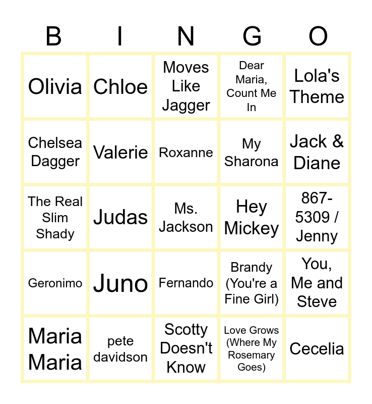 This bingo card has 39 words: Jolene, Billie Jean, Hey There Delilah, Valerie, Maria Maria, Fernando, Roxanne, Jessie's Girl, Lola's Theme, Geronimo, Judas, Dear Maria, Count Me In, Ms. Jackson, 867-5309 / Jenny, Hey Mickey, Juno, Undercover Martyn, Olivia, Natalie, Brandy (You're a Fine Girl), Chelsea Dagger, Scotty Doesn't Know, My Sharona, Jack & Diane, BILLIE EILISH., Rhiannon, Cecelia, Carolina, Breakfast at Tiffany's, Chloe, Uma Thurman, Cristina, Moves Like Jagger, pete davidson, Love Grows (Where My Rosemary Goes), Rosanna, You, Me and Steve, The Real Slim Shady and Hit the Road Jack.