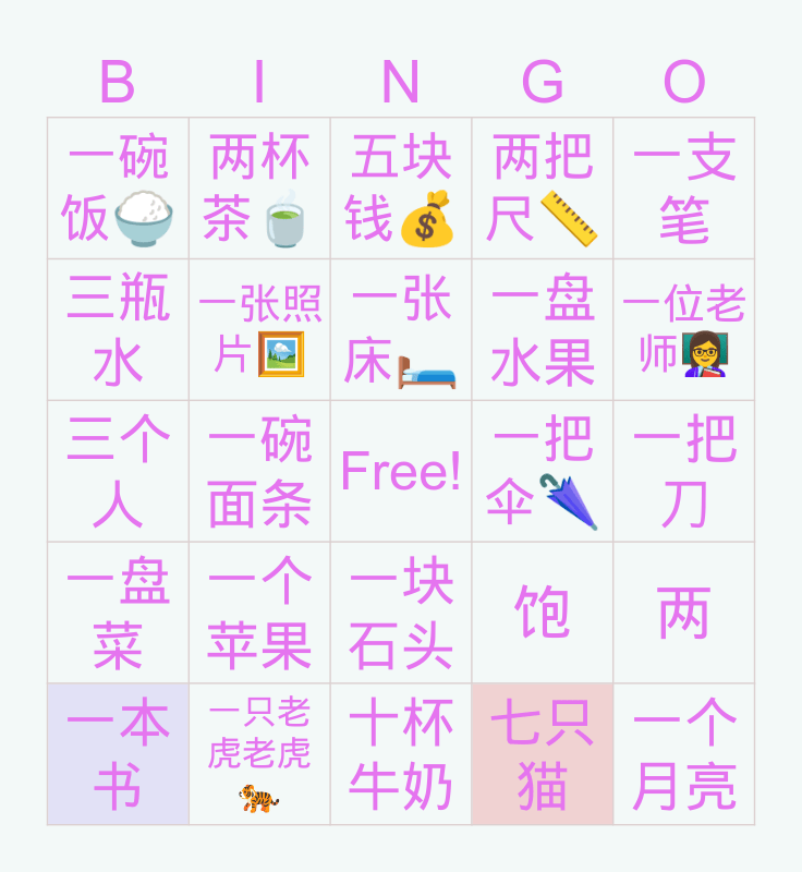 This bingo card has a free space and 24 words: 一个苹果, 一只老虎老虎🐅, 一张床🛏, 一本书, 一支笔, 一碗饭🍚, 三瓶水, 两杯茶🍵, 一把伞🌂, 一块石头, 一盘水果, 三个人, 饱, 两, 一张照片🖼, 七只猫, 一把刀, 五块钱💰, 一位老师👩🏫, 一碗面条, 一个月亮, 一盘菜, 两把尺📏 and 十杯牛奶.
