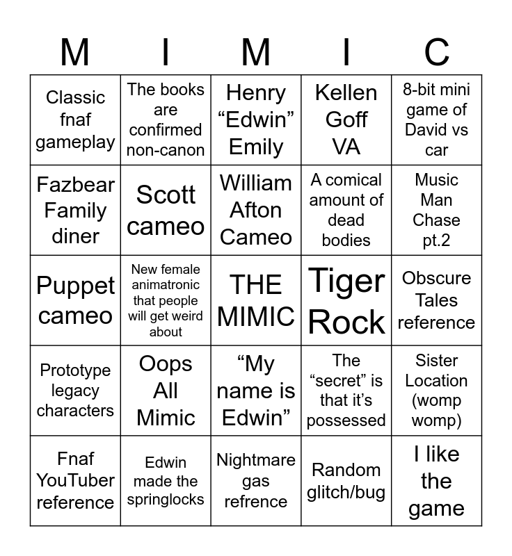 This bingo card has a free space and 24 words: Oops All Mimic, Edwin made the springlocks, William Afton Cameo, Fnaf YouTuber reference, 8-bit mini game of David vs car, Classic fnaf gameplay, Fazbear Family diner, The books are confirmed non-canon, Tiger Rock, “My name is Edwin”, A comical amount of dead bodies, Puppet cameo, The “secret” is that it’s possessed, Sister Location (womp womp), Scott cameo, Random glitch/bug, Obscure Tales reference, Henry “Edwin” Emily, Music Man Chase pt.2, New female animatronic that people will get weird about, I like the game, Prototype legacy characters, Kellen Goff VA and Nightmare gas refrence.