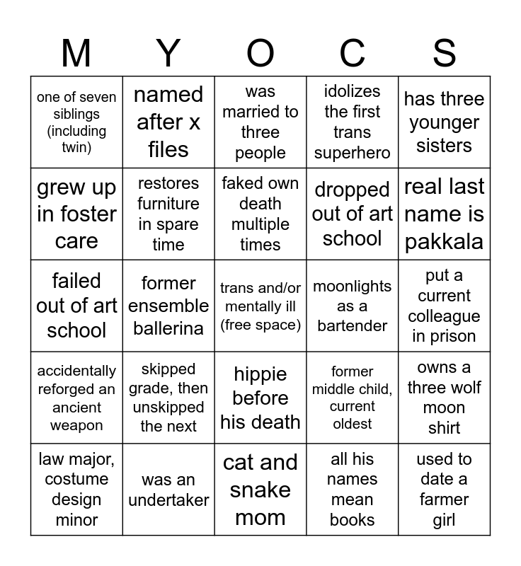 This bingo card has a free space and 24 words: skipped grade, then unskipped the next, was an undertaker, faked own death multiple times, law major, costume design minor, has three younger sisters, one of seven siblings (including twin), grew up in foster care, named after x files, moonlights as a bartender, hippie before his death, dropped out of art school, failed out of art school, former middle child, current oldest, owns a three wolf moon shirt, restores furniture in spare time, all his names mean books, put a current colleague in prison, was married to three people, real last name is pakkala, former ensemble ballerina, used to date a farmer girl, accidentally reforged an ancient weapon, idolizes the first trans superhero and cat and snake mom.
