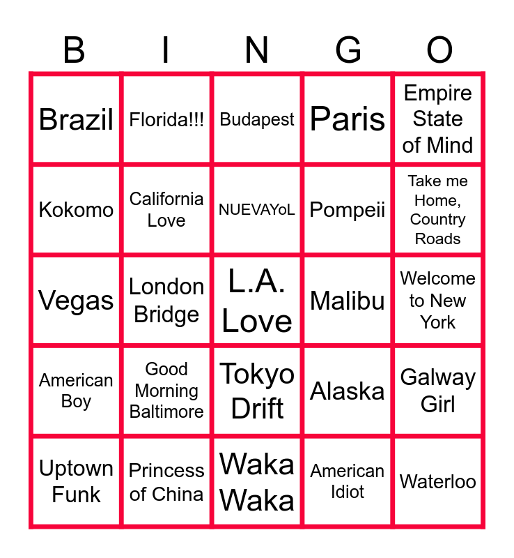 This bingo card has 41 words: Lost in Japan, Vegas, I Took A Pill In Ibiza, California Love, Princess of China, Tokyo Drift, NUEVAYoL, Havana, Empire State of Mind, American Boy, London Bridge, Paris, L.A. Love, Welcome to New York, Malibu, Good Morning Baltimore, Party in the USA, Brazil, Stick Season, Budapest, Galway Girl, Waterloo, Waka Waka, Pompeii, Waking Up In Vegas, Barcelona, American Idiot, Kids in America, Take me Home, Country Roads, Harlem Shake, Texas Hold 'Em, Florida!!!, Uptown Funk, Moving to New York, Alaska, Kokomo, Down Under, Surfin' USA, I'm Shipping Up To Boston, Walk Like an Egyptian and International Love.