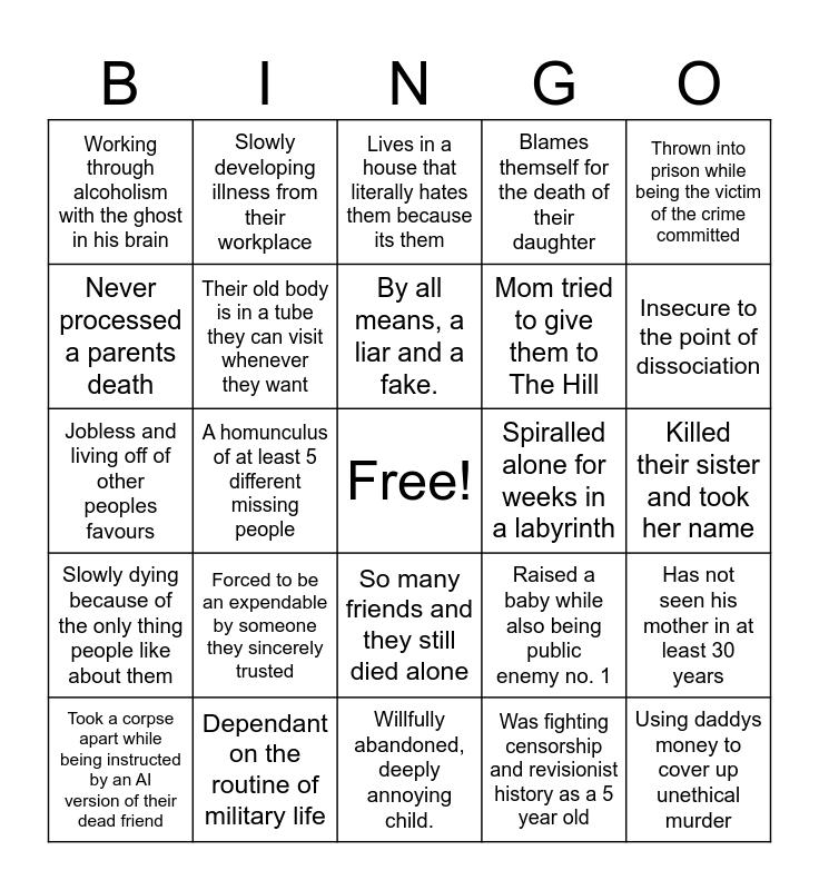 This bingo card has a free space and 24 words: Took a corpse apart while being instructed by an AI version of their dead friend, Forced to be an expendable by someone they sincerely trusted, By all means, a liar and a fake., Was fighting censorship and revisionist history as a 5 year old, Thrown into prison while being the victim of the crime committed, Working through alcoholism with the ghost in his brain, Slowly developing illness from their workplace, Lives in a house that literally hates them because its them, Spiralled alone for weeks in a labyrinth, Killed their sister and took her name, Jobless and living off of other peoples favours, Their old body is in a tube they can visit whenever they want, Raised a baby while also being public enemy no. 1, Has not seen his mother in at least 30 years, Never processed a parents death, Dependant on the routine of military life, Willfully abandoned, deeply annoying child., Blames themself for the death of their daughter, Insecure to the point of dissociation, Slowly dying because of the only thing people like about them, A homunculus of at least 5 different missing people, So many friends and they still died alone, Mom tried to give them to The Hill and Using daddys money to cover up unethical murder.