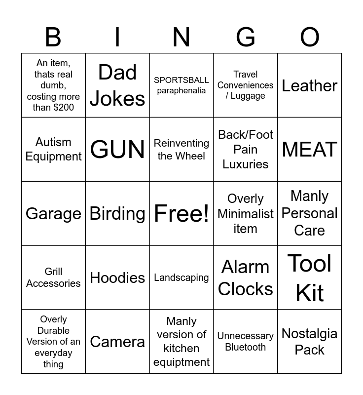 This bingo card has a free space and 54 words: Military Wannabe Paraphenalia, Grill Accessories, GOLF, Whiskey Stones, Landscaping, Booze Containment Device/Booze, Travel Conveniences / Luggage, "Smoked", Autism Equipment, Bath Accessories, An item, thats real dumb, costing more than $200, Car Comfort/ Car Gadget, Camera, Overly Durable Version of an everyday thing, Knives, Manly version of kitchen equiptment, Nostalgia Pack, Back/Foot Pain Luxuries, Power tools, Manly Personal Care, Alarm Clocks, Organizer (Not tool kit), Overly Minimalist item, Leather, Man Smells (Sandalwood, Dad Jokes, Shaving, DRONE/ RC, Bluetooth Speaker, Unnecessary Bluetooth, Mini Fridge/Cooler, Coffee/Tea, Bad Acquired Tastes, Watches, SPORTSBALL paraphenalia, Tie paraphenalia, Garage, Tool Kit, Camping Equipment, GUN, Magnets, "For Men", Paranoia, Weird 2 in 1, Hoodies, Sneakers, Coffee Table Books, Why would you give this as a gift?, Reinventing the Wheel, Birding, MEAT, FIRE, Another Goddamned Wallet and Dog/Cat Dad.