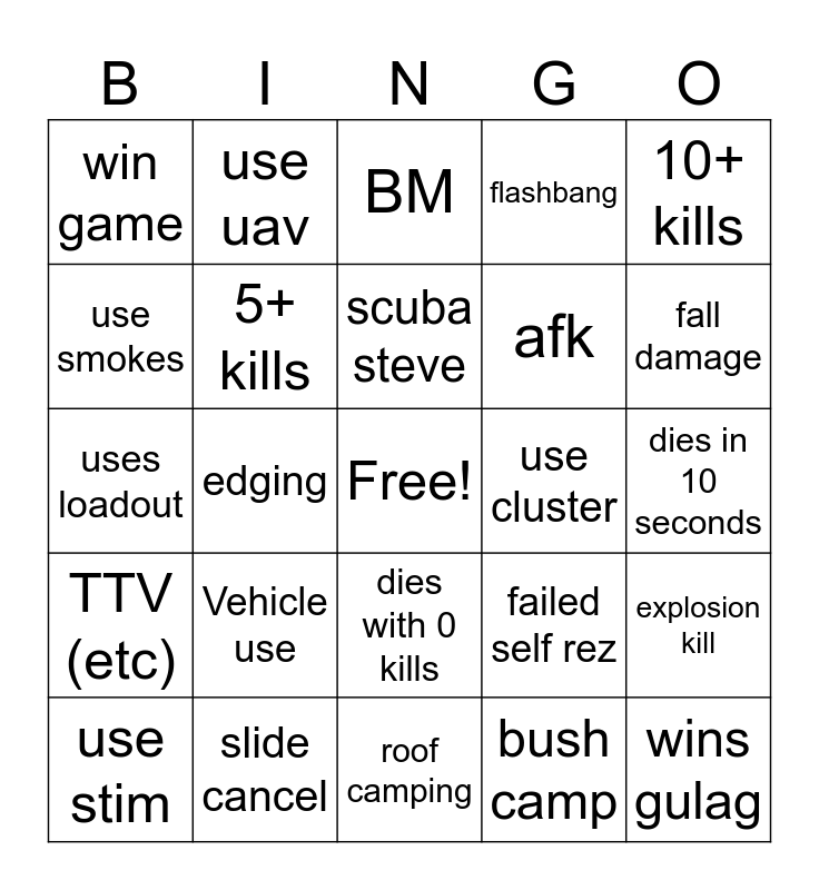 This bingo card has a free space and 24 words: Vehicle use, slide cancel, scuba steve, use stim, 10+ kills, win game, use smokes, use uav, use cluster, dies with 0 kills, afk, uses loadout, failed self rez, explosion kill, 5+ kills, bush camp, dies in 10 seconds, BM, fall damage, edging, wins gulag, TTV (etc), flashbang and roof camping.