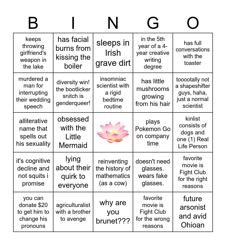 This bingo card has a free space and 24 words: lying about their quirk to everyone, agriculturalist with a brother to avenge, insomniac scientist with a rigid bedtime routine, you can donate $20 to get him to change his pronouns, has full conversations with the toaster, keeps throwing girlfriend's weapon in the lake, murdered a man for interrupting their wedding speech, has facial burns from kissing the boiler, plays Pokemon Go on company time, reinventing the history of mathematics (as a cow), has little mushrooms growing from his hair, alliterative name that spells out his sexuality, doesn't need glasses. wears fake glasses., favorite movie is Fight Club for the right reasons, diversity win! the bootlicker snitch is genderqueer!, favorite movie is Fight Club for the wrong reasons, kinlist consists of dogs and one (1) Real Life Person, sleeps in Irish grave dirt, tooootally not a shapeshifter guys, haha, just a normal scientist, obsessed with the Little Mermaid, future arsonist and avid Ohioan, it's cognitive decline and not squits i promise, in the 5th year of a 4-year creative writing degree and why are you brunet???.