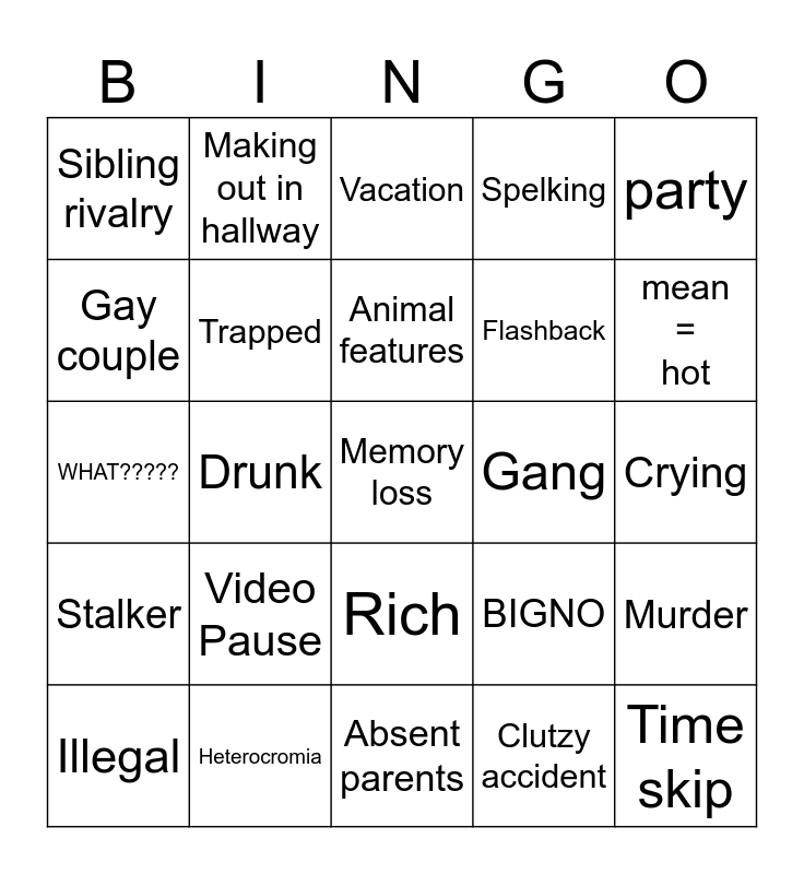 This bingo card has 25 words: Video Pause, Absent parents, Animal features, Illegal, party, Sibling rivalry, Gay couple, Making out in hallway, Gang, Rich, Flashback, WHAT?????, BIGNO, Murder, Trapped, Time skip, Crying, Vacation, mean = hot, Drunk, Memory loss, Heterocromia, Stalker, Spelking and Clutzy accident.