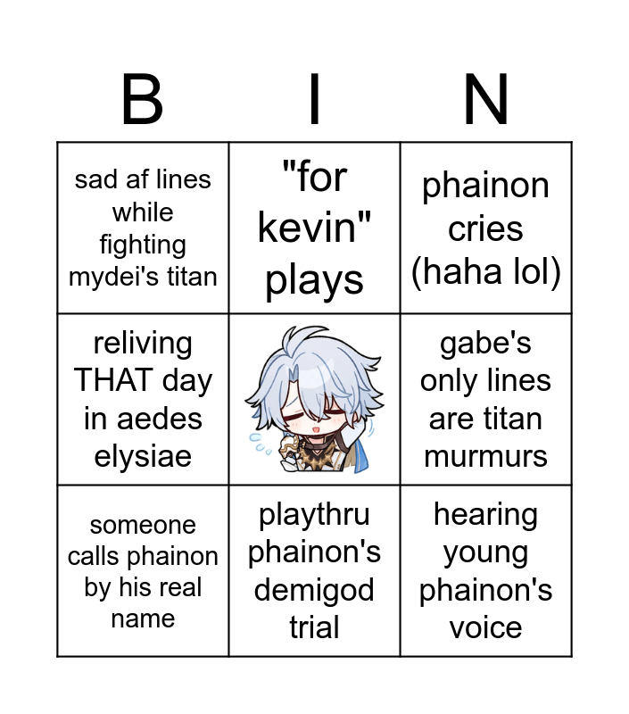 This bingo card has a free space and 8 words: gabe's only lines are titan murmurs, phainon cries (haha lol), "for kevin" plays, someone calls phainon by his real name, sad af lines while fighting mydei's titan, hearing young phainon's voice, reliving THAT day in aedes elysiae and playthru phainon's demigod trial.