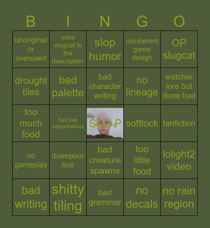 This bingo card has a free space and 24 words: downpour lore, shitty tiling, bad character writing, bad writing, OP slugcat, unoriginal or overused, drought tiles, uses slugcat in the description, softlock, bad creature spawns, no lineage, too much food, too little food, lolight2 video, bad palette, no decals, fanfiction, slop humor, watcher lore but done bad, bad lore interpritations, no rain region, no gameplay, incoherent game design and bad grammar.