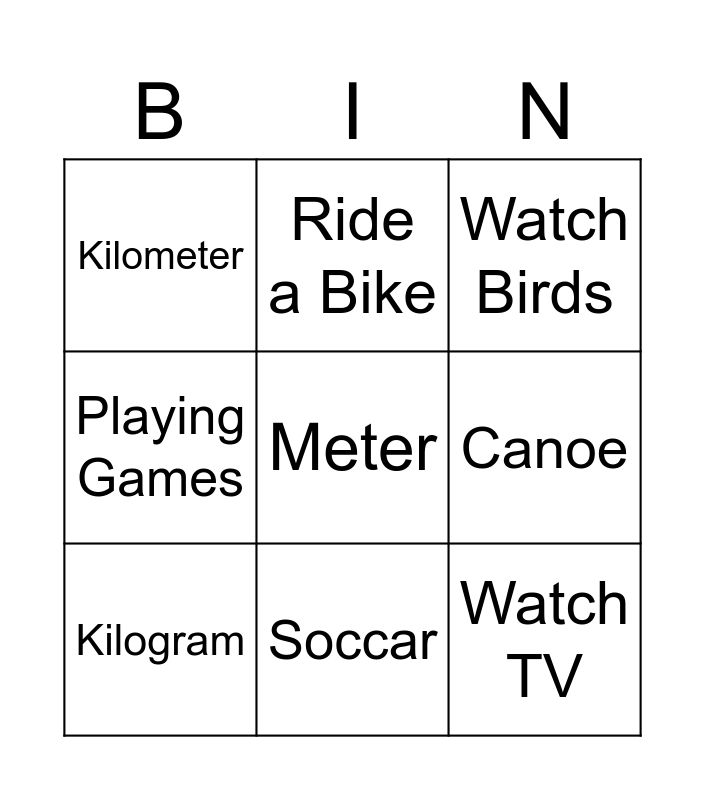 This bingo card has a free space and 8 words: Canoe, Watch Birds, Ride a Bike, Kilogram, Kilometer, Watch TV, Playing Games and Soccar.