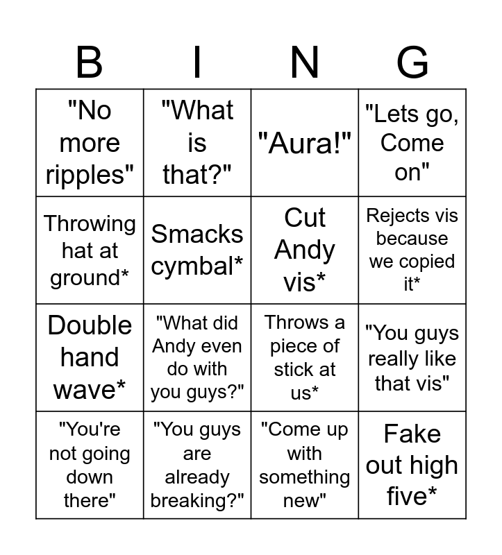 This bingo card has 16 words: "You guys are already breaking?", "You guys really like that vis", "Aura!", "No more ripples", Double hand wave*, "What is that?", Throws a piece of stick at us*, "Come up with something new", Throwing hat at ground*, Smacks cymbal*, "You're not going down there", "Lets go, Come on", "What did Andy even do with you guys?", Rejects vis because we copied it*, Cut Andy vis* and Fake out high five*.