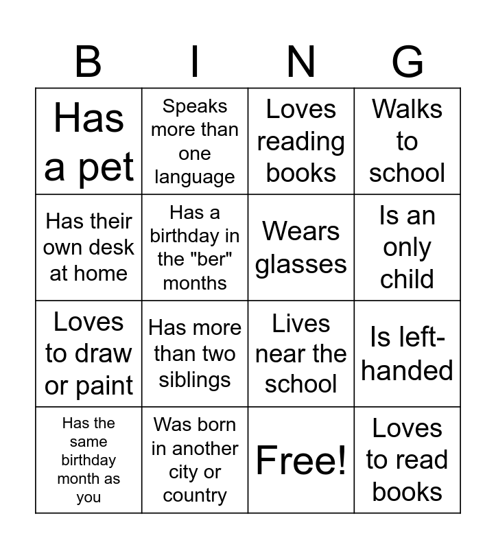 This bingo card has 17 words: Free!, Has the same birthday month as you, Loves reading books, Has a pet, Has more than two siblings, Walks to school, Is left-handed, Wears glasses, Is an only child, Has a birthday in the "ber" months, Was born in another city or country, Lives near the school, Has their own desk at home, Speaks more than one language, Loves to draw or paint, Plays a musical instrument and Loves to read books.