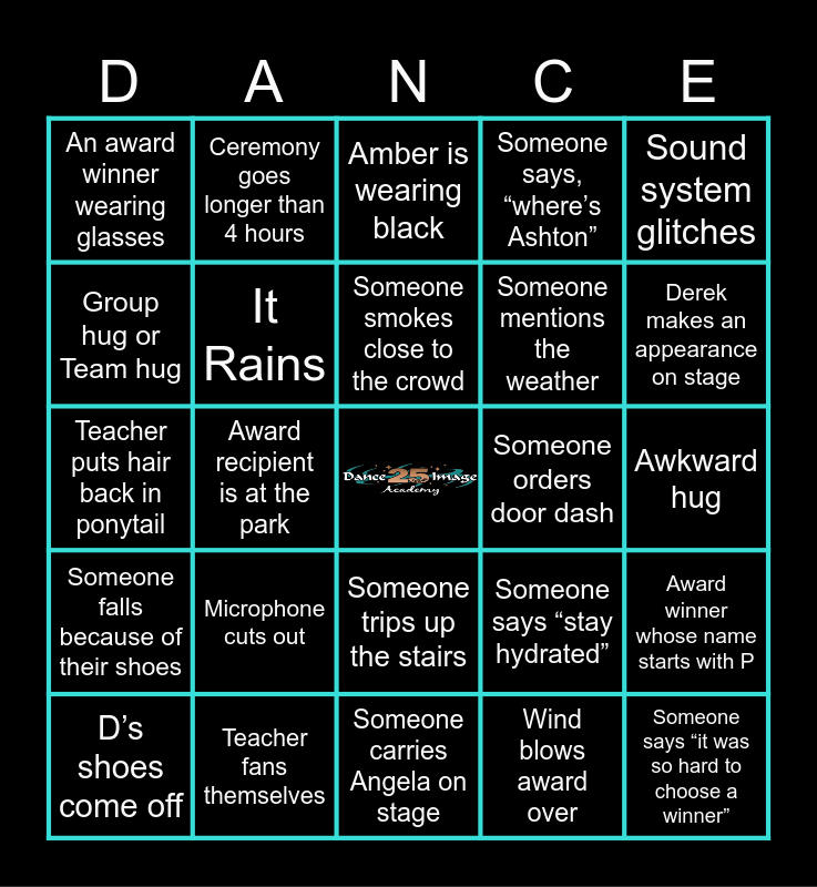 This bingo card has a free space and 39 words: D cries, Someone cartwheels on stage, Someone yells, “we can’t hear you”, It Rains, D’s shoes come off, Someone trips up the stairs, Someone smokes close to the crowd, Award recipient’s name ends in Lee/Ly, Sound system glitches, Someone falls because of their shoes, Award recipient is at the park, Someone says, “where’s Ashton”, Someone says “it was so hard to choose a winner”, Awkward hug, Someone orders door dash, Microphone cuts out, Award recipient isn’t here, An award winner wearing glasses, Someone drops their award, Someone says “stay hydrated”, Group hug or Team hug, Someone carries Angela on stage, Someone mentions the weather, Derek makes an appearance on stage, D calls someone a cutie, Angela tries to stand up to give a hug, Balloon flies away, Small child grabs a decoration, Lindsey sneaks a drink, Ceremony goes longer than 4 hours, Teacher asks for food on stage, Stage lights turn on, Amber is wearing black, Teacher fans themselves, Wind blows award over, More than 3 teachers are wearing sunglasses, Award winner whose name starts with P, Teacher puts hair back in ponytail and Shayla hugs recipient.