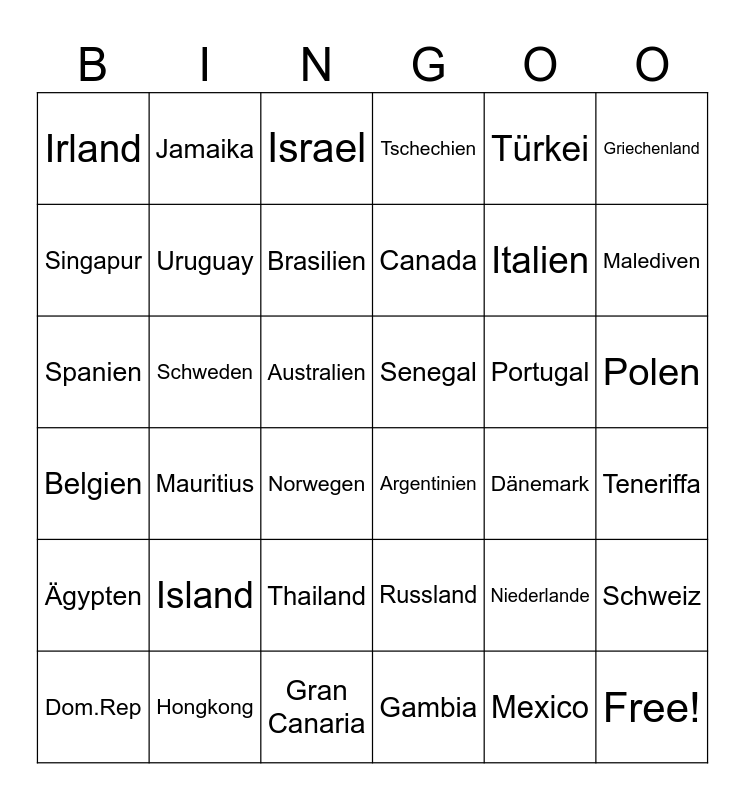 This bingo card has 42 words: Mexico, Uruguay, Barbados, Portugal, Teneriffa, Mauritius, Spanien, Marokko, Israel, Polen, Australien, Canada, Malediven, Türkei, Hongkong, Belgien, Schweiz, Italien, Free!, Jamaika, Griechenland, Thailand, Ägypten, Irland, USA, Dom.Rep, Brasilien, Frankreich, Island, Niederlande, Rumänien, Senegal, Singapur, Dänemark, Gran Canaria, Norwegen, Argentinien, Schweden, Russland, Gambia, Tschechien and China.