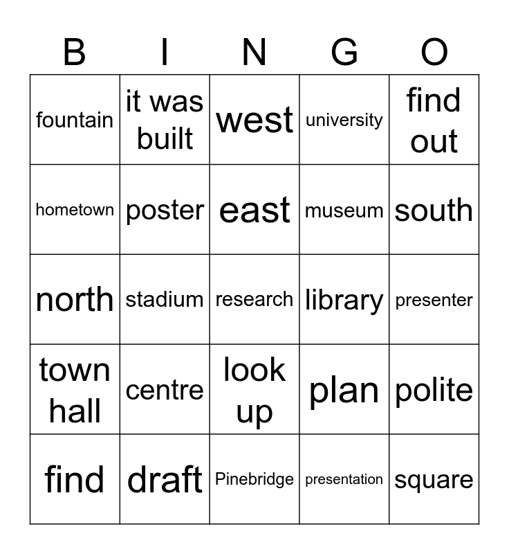 This bingo card has a free space and 24 words: centre, draft, east, find, find out, fountain, hometown, it was built, library, look up, museum, north, plan, polite, poster, presentation, presenter, west, south, stadium, square, town hall, university and Pinebridge.